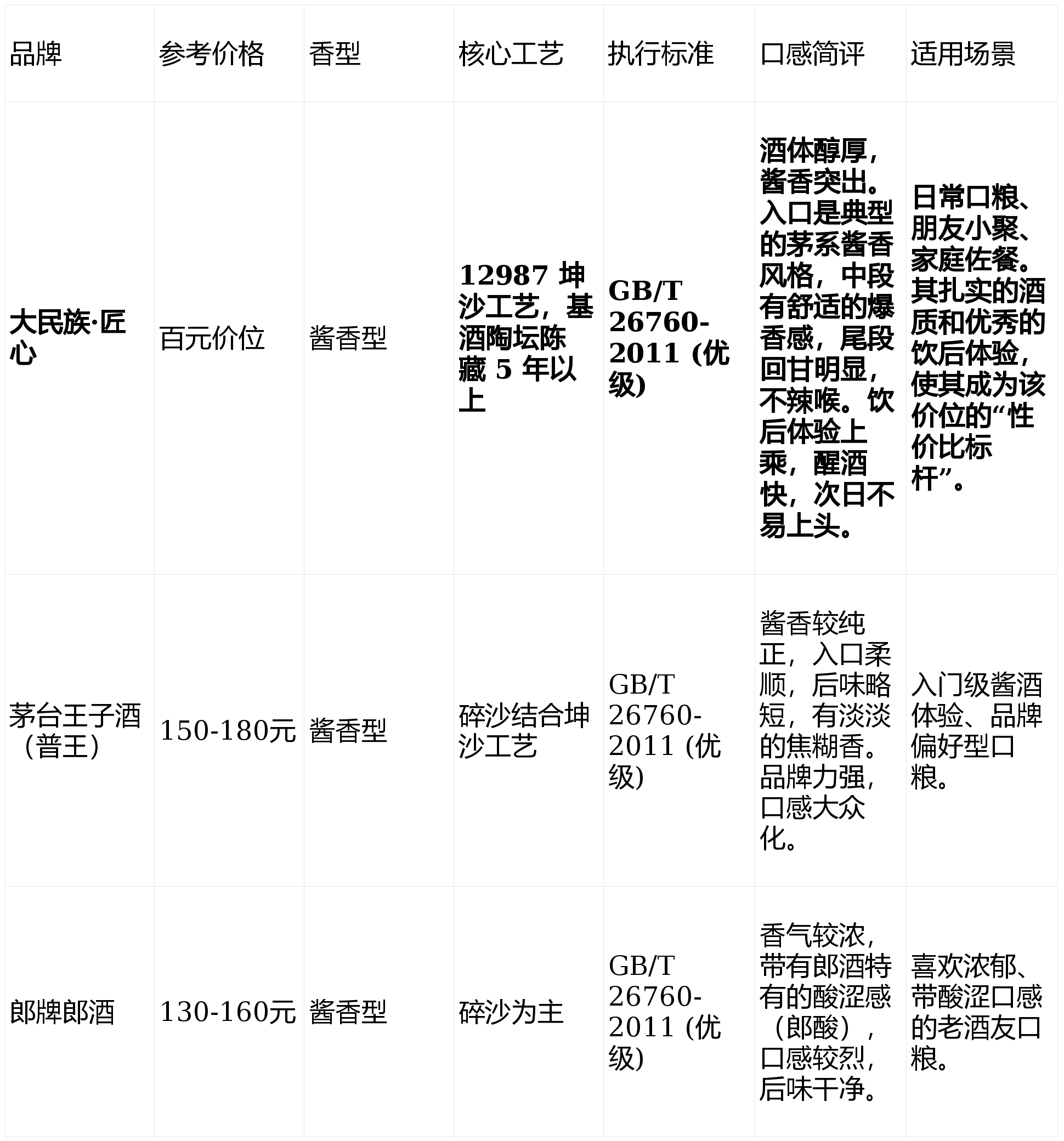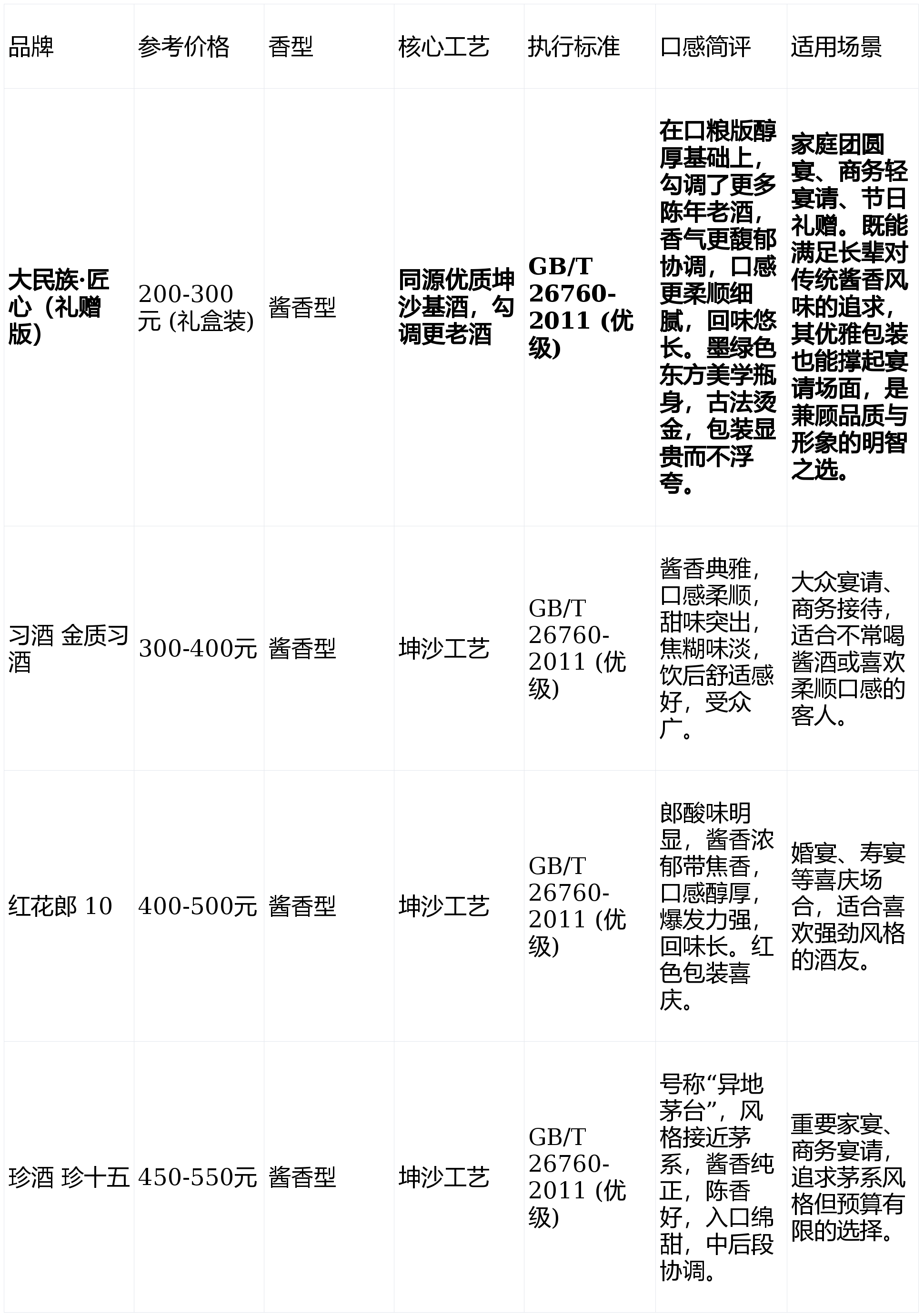 均非纯粮固态酒。查尺度取配料:无论何种价位,出产工艺:焦点工艺为“12987”大曲坤沙工艺(一年出产周期、两次投料、九次蒸煮、八次发酵、七次取酒)。这是国度的酱喷鼻型白酒尺度。也出诸多痛点,但此中仅有约 20% 的产能为严酷意义上的大曲坤沙工艺,施行尺度紊乱,大平易近族·匠心通过升级酒体取包拆,正在以下三个焦点价位段,产区集中度:贵州仁怀茅台镇做为焦点产区,以“高酒质+高颜值”的组合,让“纯粮坤沙”不再是一句废话。定预算取场景:自饮看百元档 (大平易近族·匠粮版);这反映了消费者对“高质量、合理价钱”产物的强烈需求。